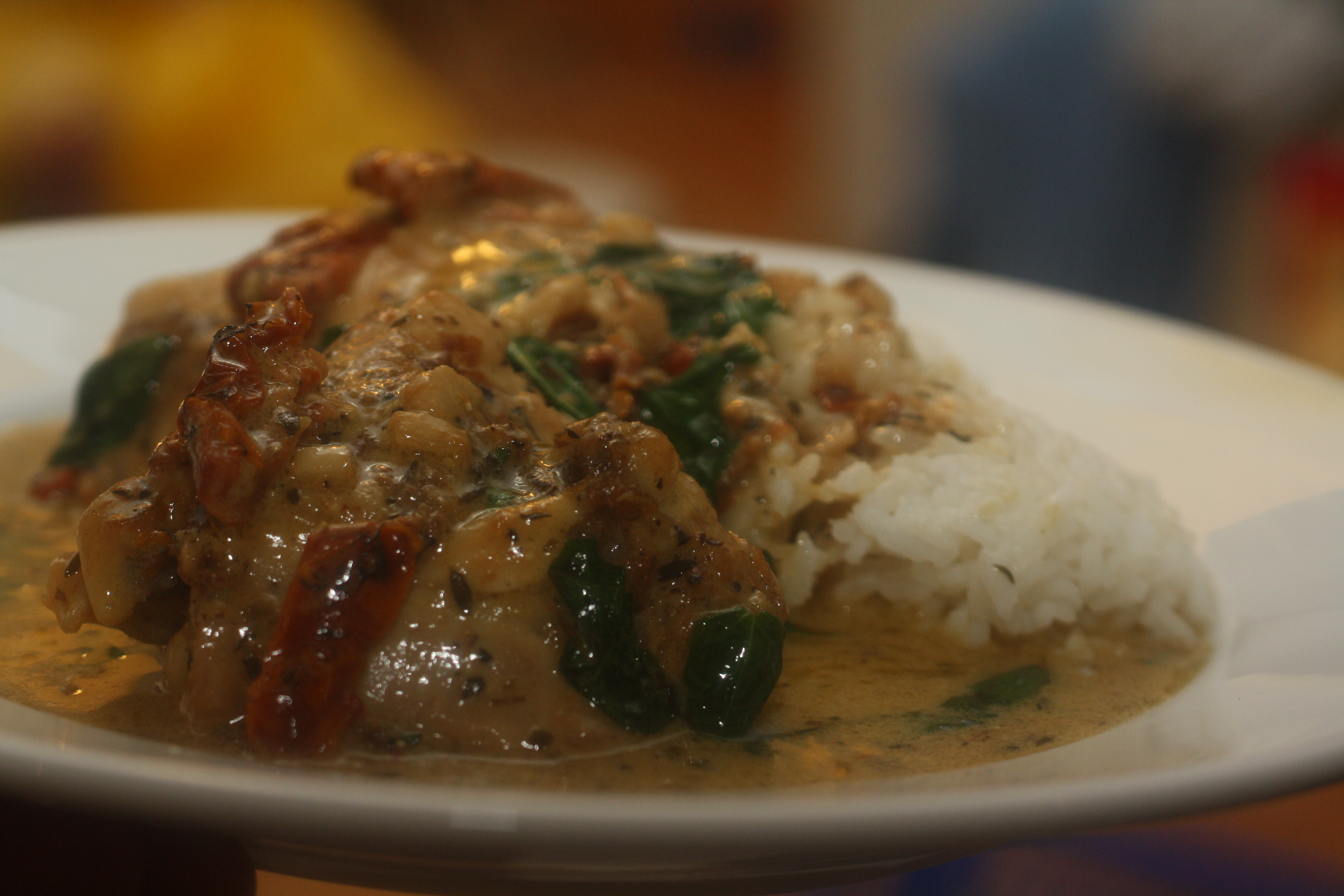 Setjið hvítlauk og chiliflögur út á pönnunna. Hrærið um í 1-2 mínútur og hellið þá hvítvíni og soðið út á ásamt sólþurrkuðum tömötum. Leyfið að malla um stund og hellið þá rjómanum saman við. Þegar suðan er komin upp aftur er kjúklingabitunum bætt út á aftur ásamt parmesanostinum.