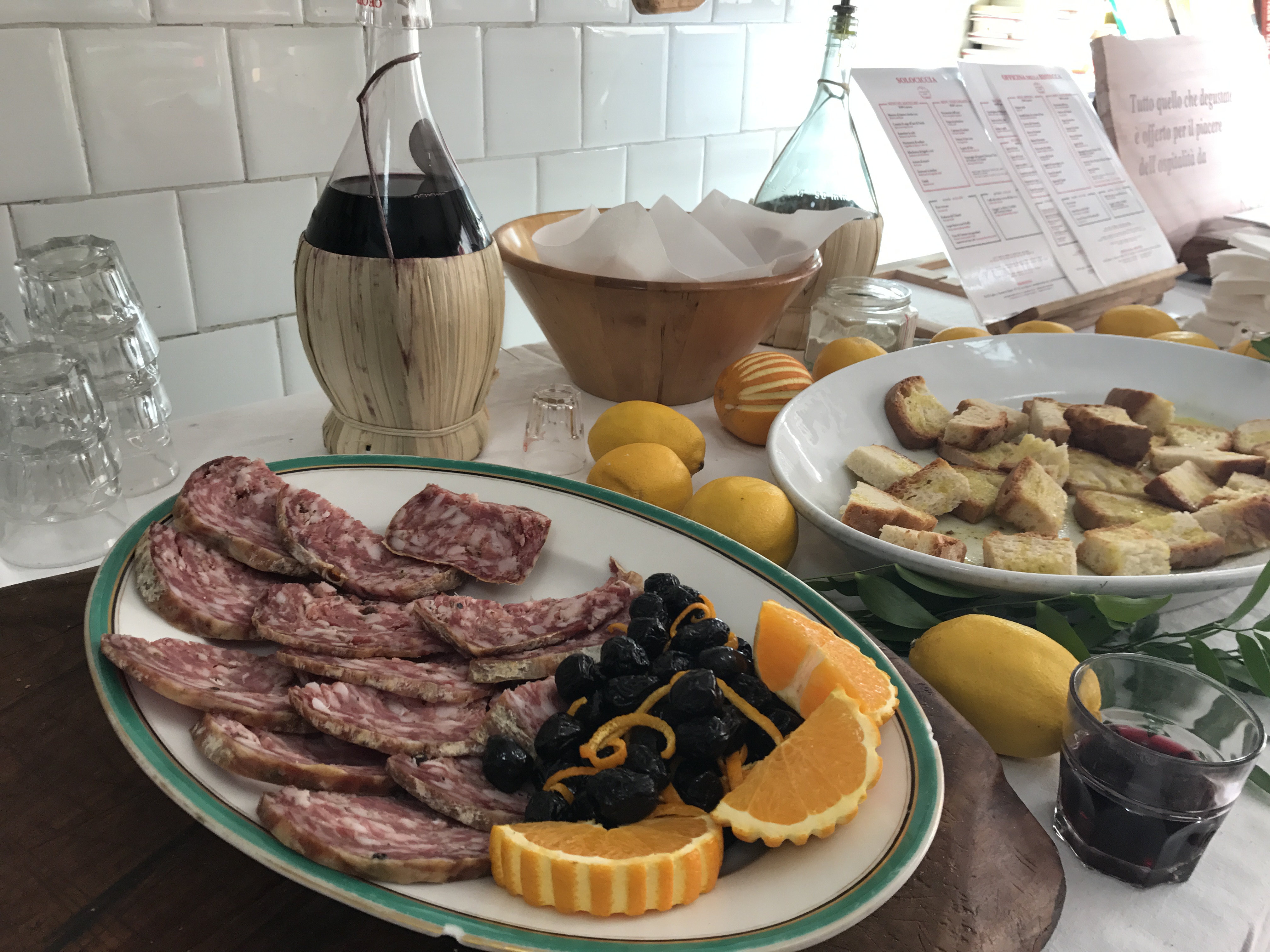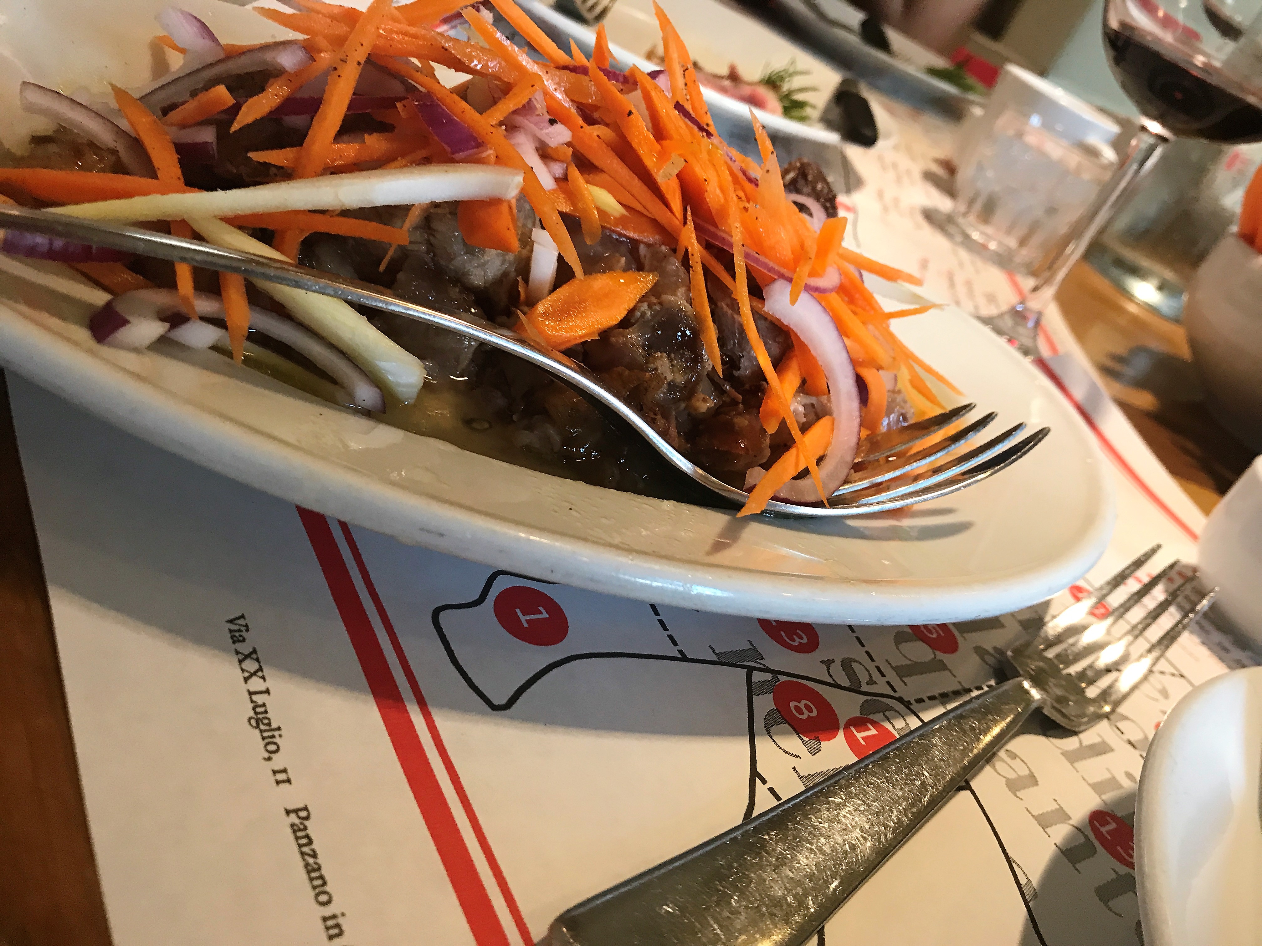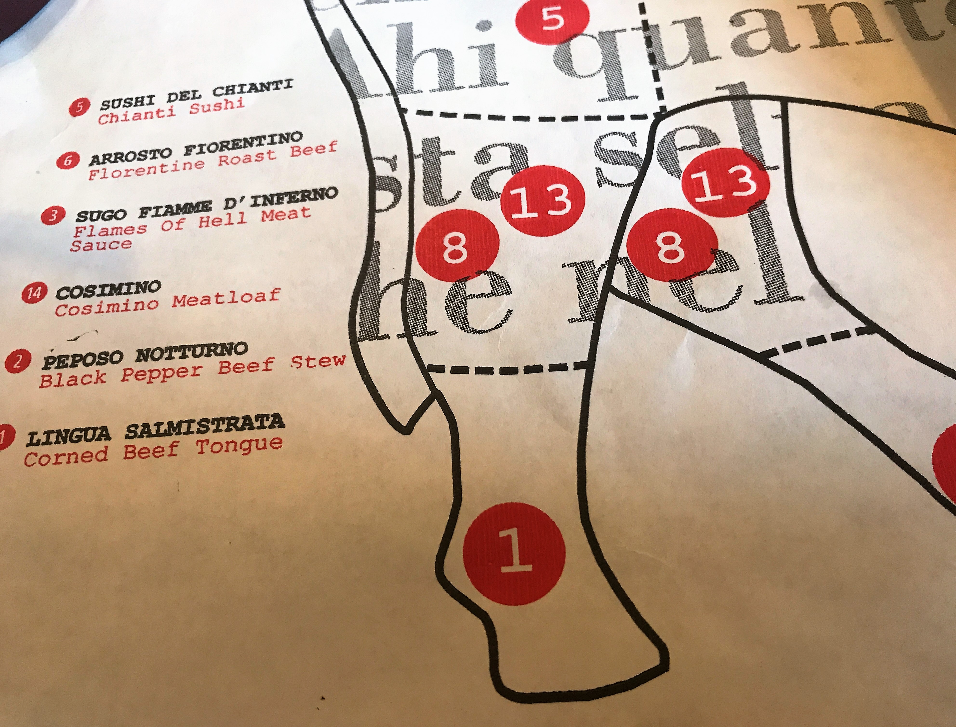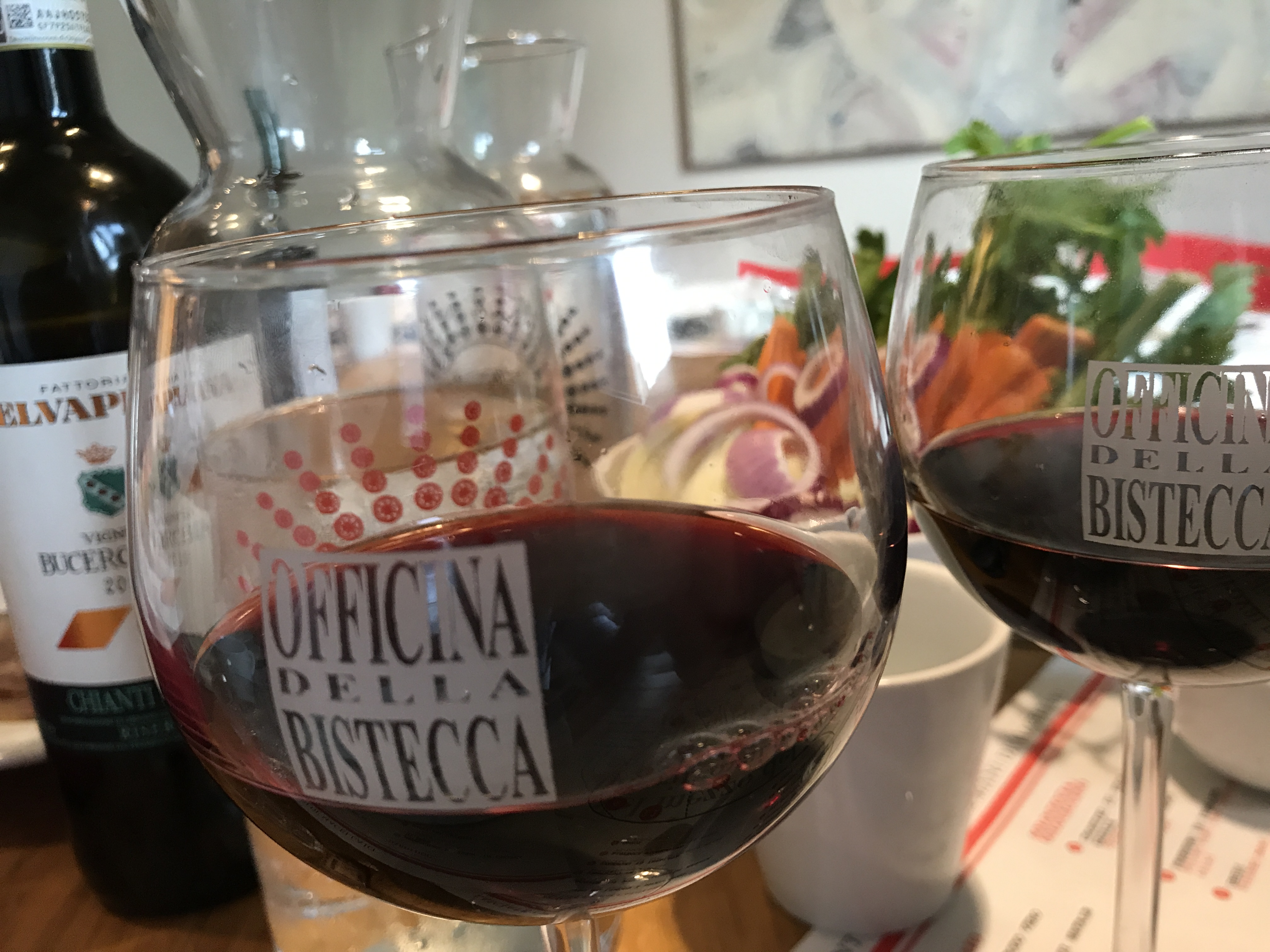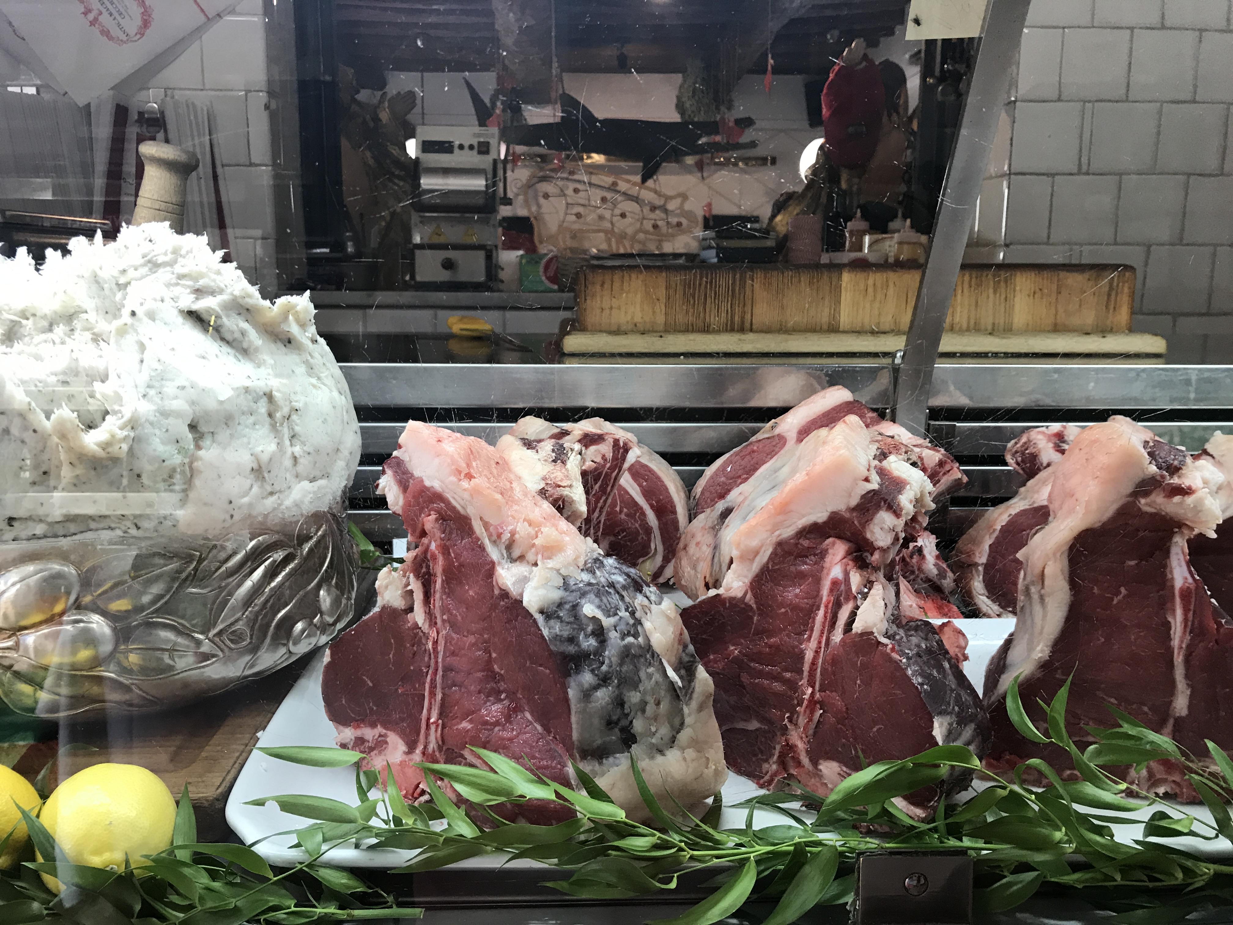 Í fyrsta lagi Officina della Bistecca, þar sem hugmyndir er að bera fram stórsteikur fyrir fólk með góða matarlyst, og það er þörf á góðri matarlyst til að ná að torga öllu því kjötmeti sem borið er fram. Á Solosiccia hinum megin við götuna er áherslan á hugmyndina um að nýta alla skepnuna og gestir fá seðil þar sem fjölmargar ólíkar útgáfur eru bornar fram, langeldaðar, steiktar, grillaðar.  Á báðum stöðum er reglan sú að einn seðill er í boði, þú situr til borð við langborð eða hringborð með öðrum gestum sem pantað eiga sama kvöld. Innifalið í seðlinum er einnig vín frá Cecchini, alveg hreint prýðilegt Chianti-vín, en gestum er einnig velkomið að koma með sitt eigið vín án tappagjalds.